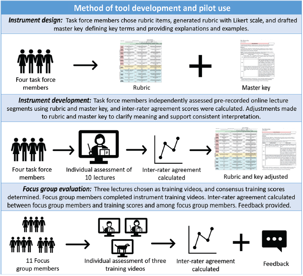 This rubric was then given to eleven focus group members drawn from multiple veterinary education programs, with a wide range of experience and training: some being veterinary doctors, some technician educators, and some education experts. These folks read our instructions for use, then tested the tool out on three videos for part of their frame of reference training.