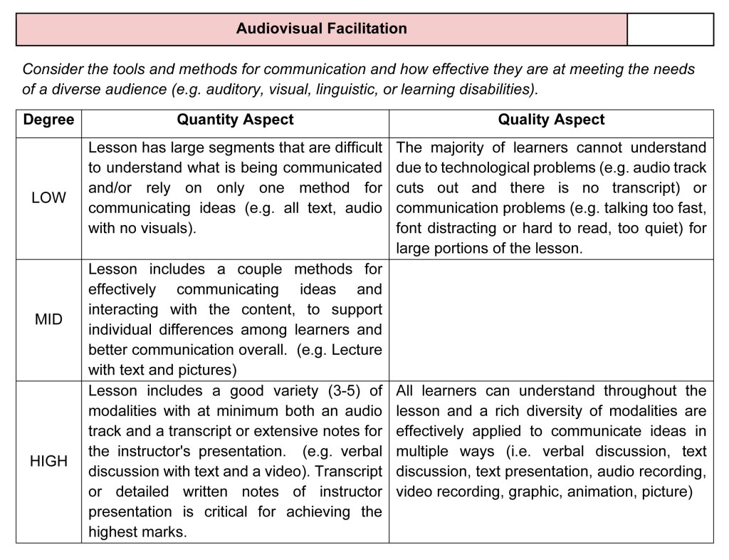 The FARPET makes use of a rubric for marking quality on seven or ten items, depending on whether the observed lesson is asynchronous (7) or synchronous (10). The rubric for each item contains five levels with descriptors at the low, middle, and high marks.